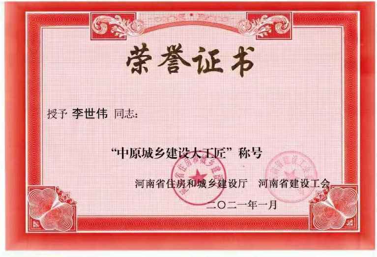 宁波兴旺竹木加工有限公司李世伟同志获“中原城乡建设大工匠”称号